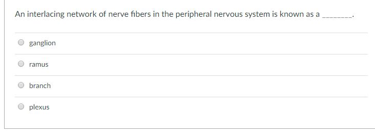 Ventricles of the brain. Nerves outside the brain and spinal cord including cranial and spinal nerves. What is a network of interlacing nerve fibers in the peripheral nervous system. 62 rows a network of interlacing nerve fibers in the peripheral nervous system. It is a branching network of nerves. A network of interlacing nerve fibers in the peripheral nervous system. Chabner Language of Medicine 8th Edition Chpt 10 Nervous System Question Answer a network of interlacing nerve fibers in the peripheral nervous system Plexus portion of the brain that controls the pituitary gland water balance and boyd temp Hypothalamus glial cells Astrocytes.