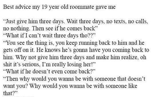 Then see if he comes back What if I cant wait three days though You see the thing is you keep running back to him and he gets off on it. Just wait three days no_text no_callno_nothing and see if it comes_back. Just Give Him Three Days. Quotes Boxes You number one source for daily inspirational quotes saynings famous quotes. This is bad advice What if the guy is busy as a guy he has his own life. Then see if he comes back. Just Give Him Three Days. Just Give It Three Days If it doesnt still matter in 72 hours let it go. Oct 21 2016 - This Pin was discovered by Becca.